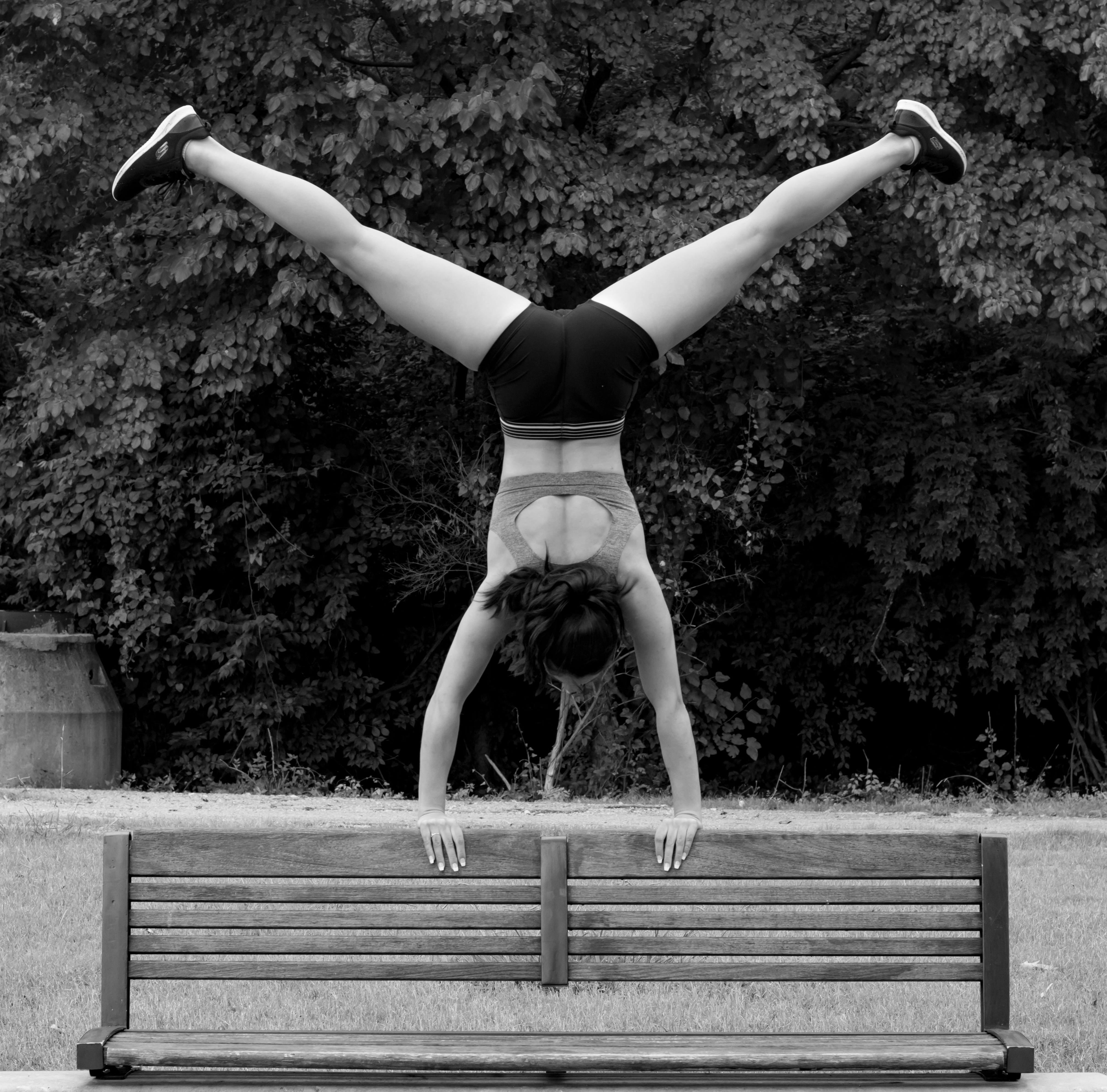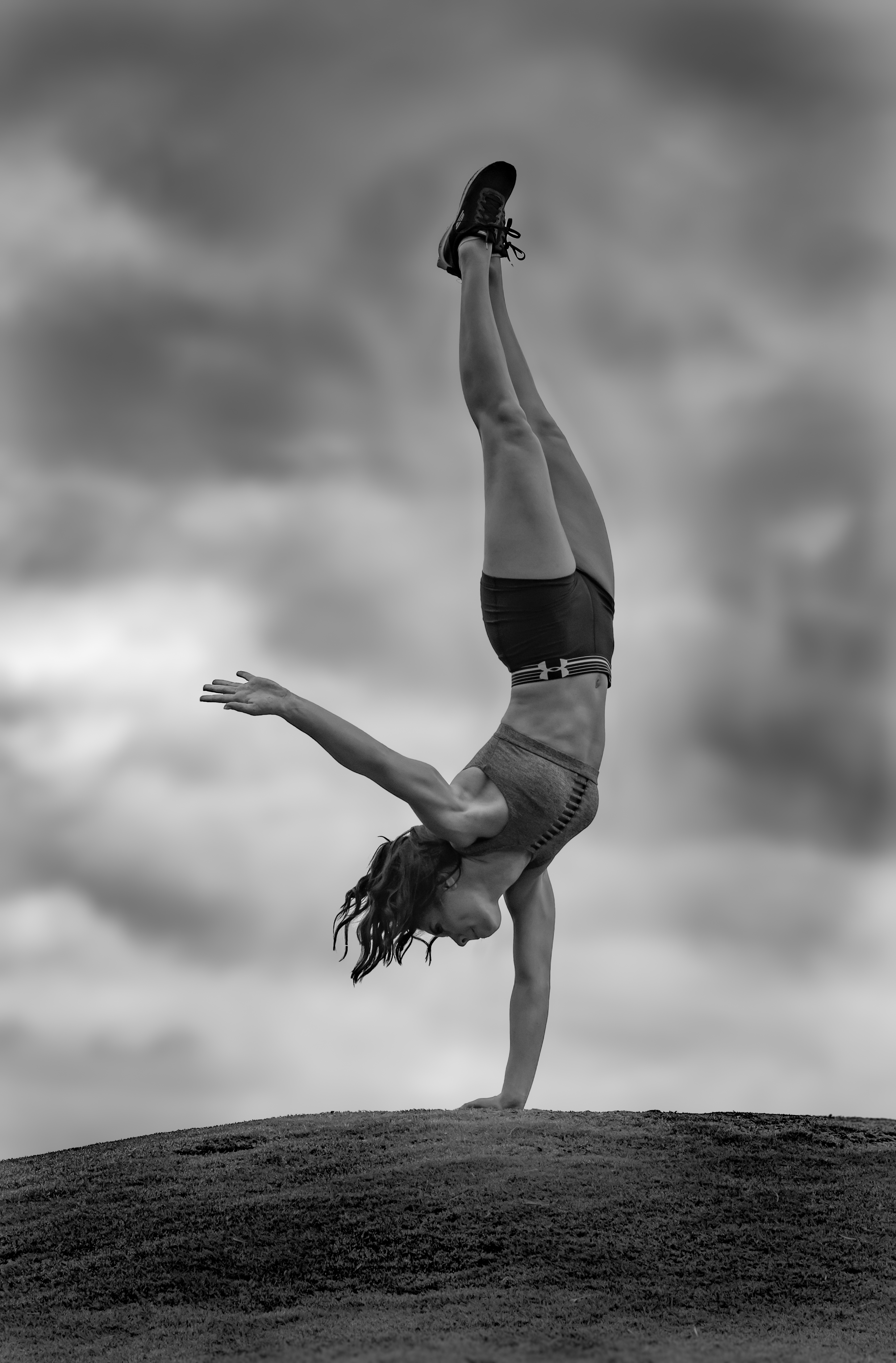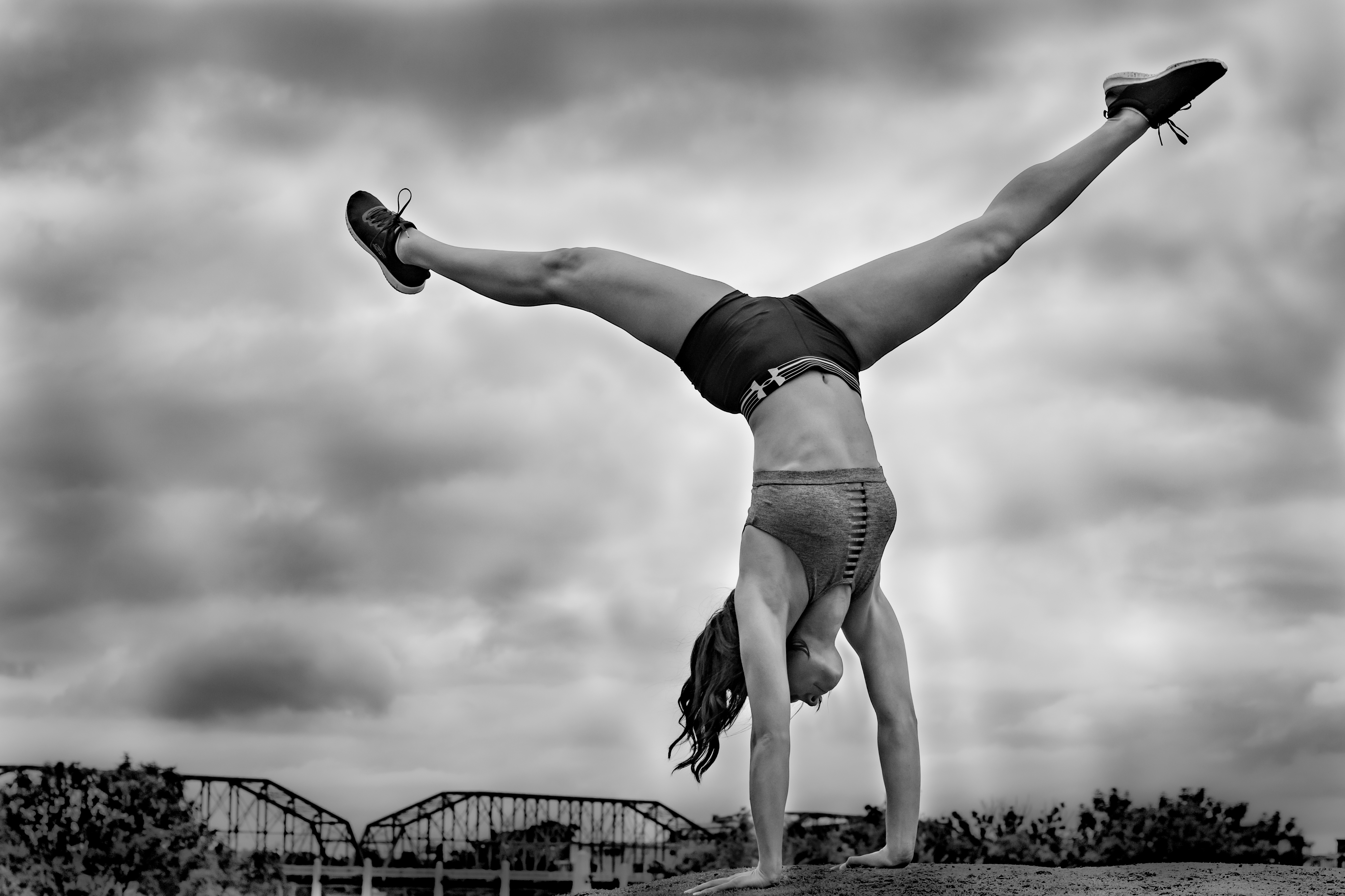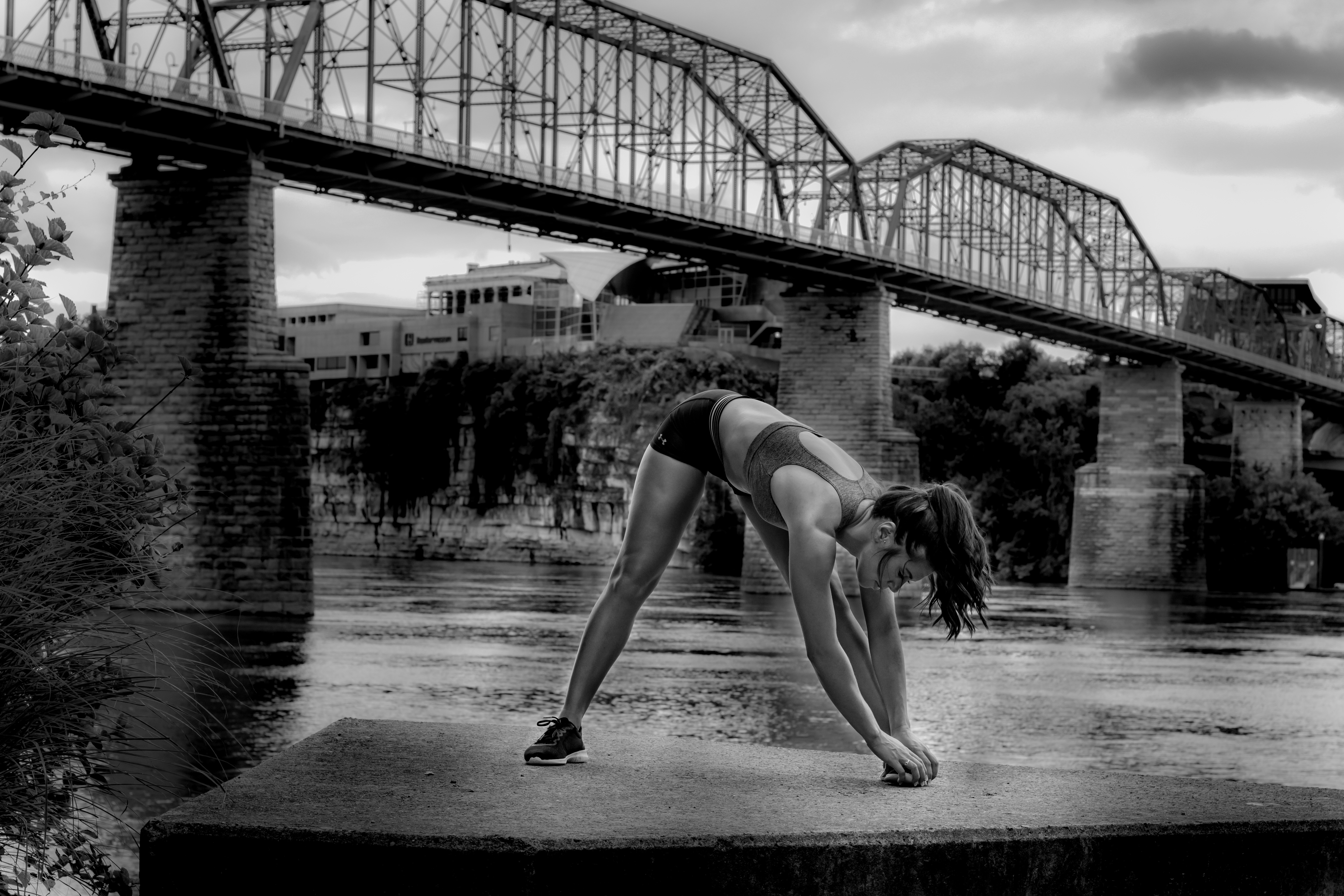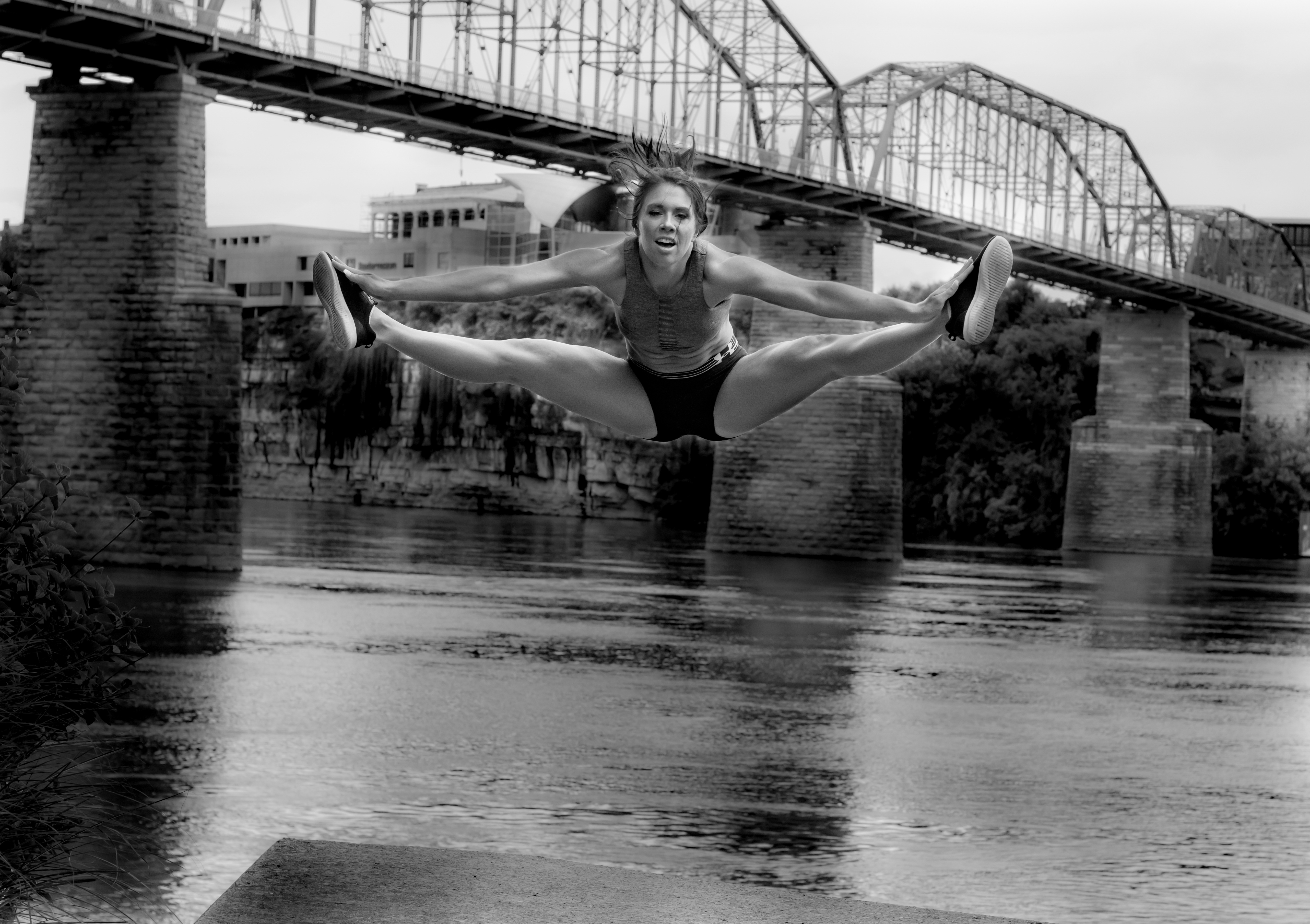 - Symmetry in Flight captures a rare moment where the rigid, unyielding world of industrial engineering meets the fluid capability of the human body. Set against the rhythmic, repeating steel beams of the Walnut Street Bridge, the image highlights a powerful juxtaposition. While the bridge is built of heavy iron and fixed in place, the dancer mirrors that same structural strength through a precise, athletic leap. The title refers to how the dancer’s form aligns with the bridge’s architecture—the angle of her limbs echoing the geometric "V" shapes of the trusses. By stripping away color in favor of a monochromatic finish, the focus remains entirely on these shapes, textures, and the shared "grace" found in both man-made landmarks and natural movement. It is a study of balance, showing that even the heaviest environments can feel weightless when met with the right momentum.